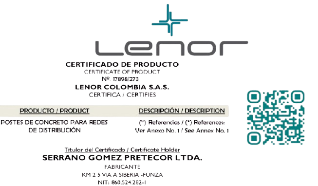 Contamos con certificado de producto expedido por la empresa certificadora “Lenor”, con número 17893/273. Este certifica que nuestros postes de concreto para redes de distribución cumplen con la Resolución 4117 del 2 de abril de 2024 y con el esquema de certificación Scheme No. 5 RETIE. Para validaciones, puede ingresar a la página www.lenorgroup.com
